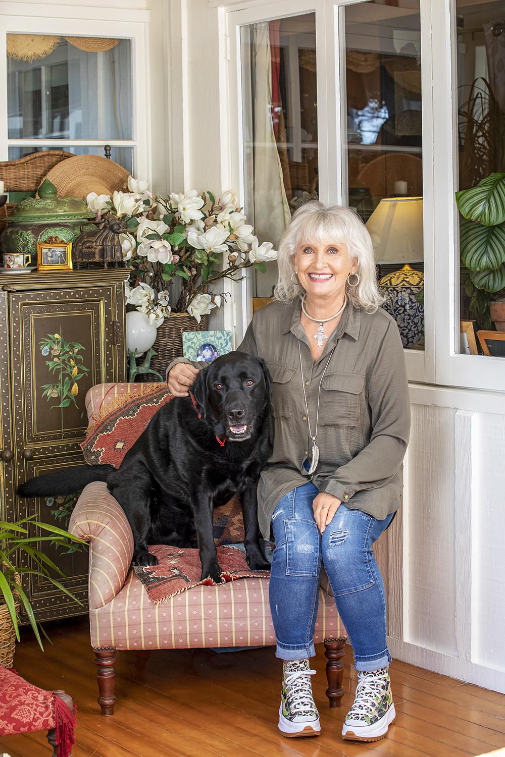 Annie surrounded by her treasures, including Labrador Ted.