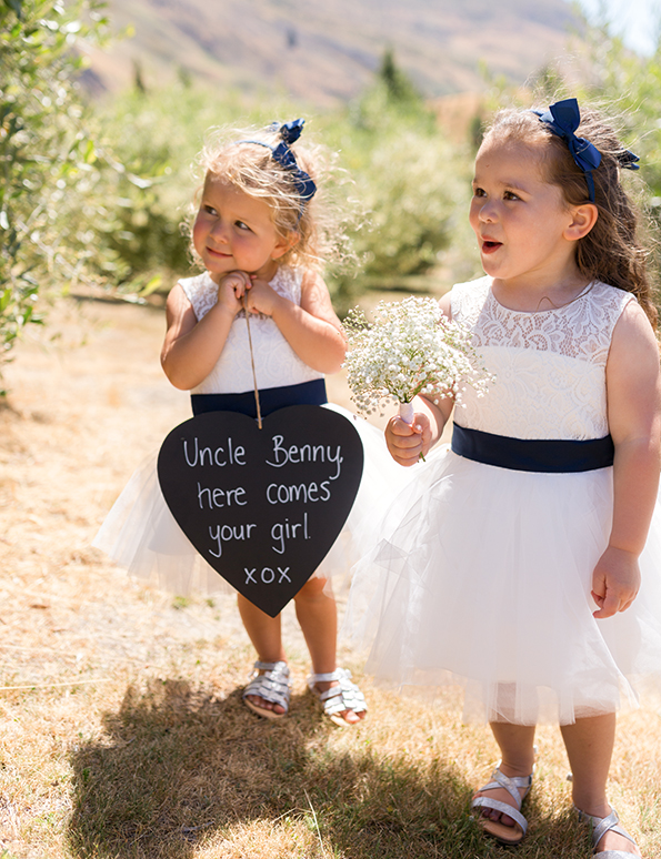Finally, at 3.18pm, Dunedin singers Libby and Beth Hamilton begin singing Ellie Goulding’s How Long Will I Love You and the five bridesmaids – along with the flower girls, Katie’s niece, Madison Menzies, and Holly’s daughter, Ruby Leonard – begin the walk through the olive grove towards the chiffon-draped arch.