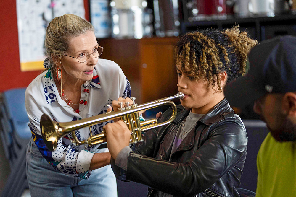 “It all starts when a student wanders into my music room, telling me he and some of his friends want to join the brass band,” explains Suzy. “I’m excited because, as I say in the movie, the brass instrument is a bit of a dying art, and I watch in awe as, one by one, these gorgeous teens file in behind him. Then he says, ‘Oh, my dad wants to come too,’ which I interpret as his father wanting to support his son. But no, the dad wants to learn to play and my jaw drops even further when several adults join the band.”