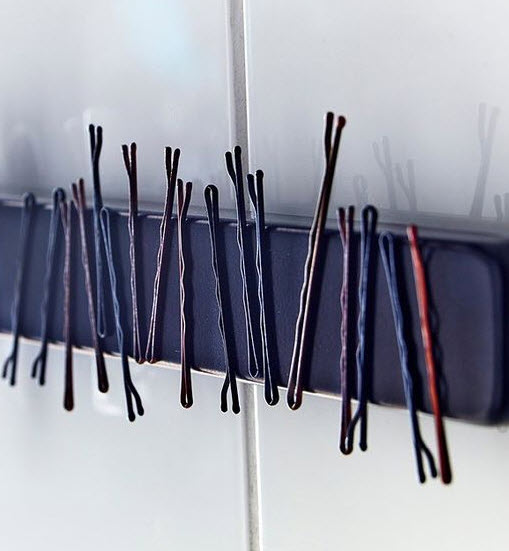 A magnetic rail inside the wardrobe door is the perfect place to store hair pins, scissors or tweezers that always go walkabout (especially if you don’t want these on display). Get hold of one of these in a hardware or stationery store. Via