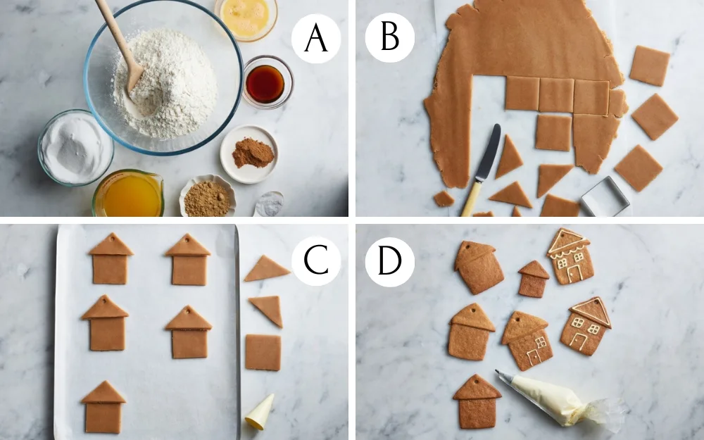 - Arrange squares on trays about 3cm apart. Place a triangle on top of each square slightly overlapping to form a house shape. Press gently over the join to seal (C). Using a skewer, make a small hole in the top of each house, not too close to the edge.