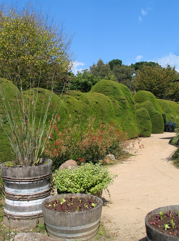 This irregularly shaped hedge works with the winding path and casual arrangement of container plants