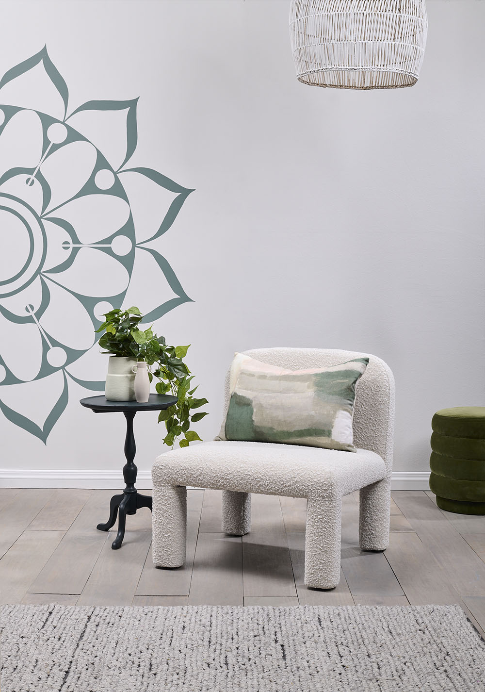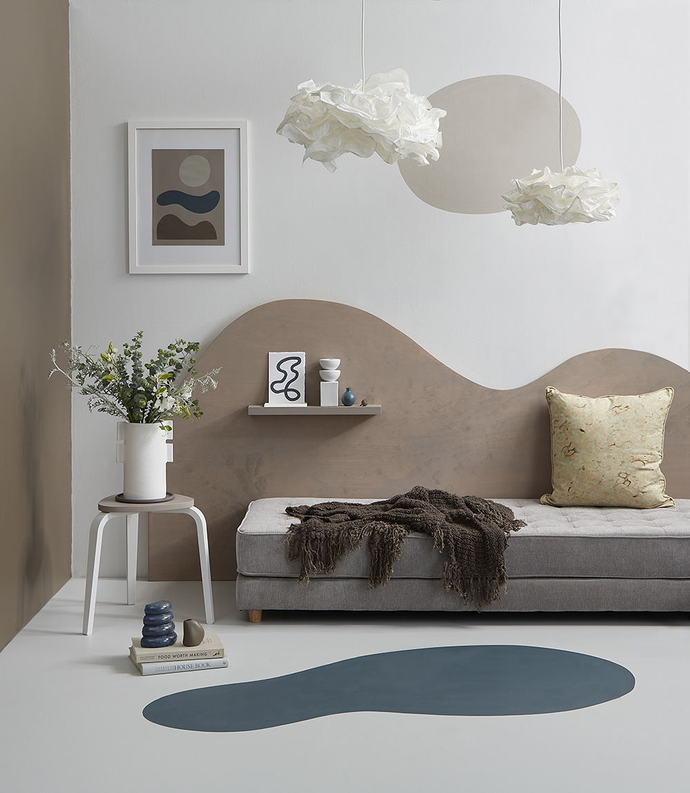 Bursts of brighter colour against a neutral background can also be atmospheric. Including them in the form of organic shapes is ideal in a zen zone, as the gentle curves feel welcoming while adding interest to an otherwise plain palette.