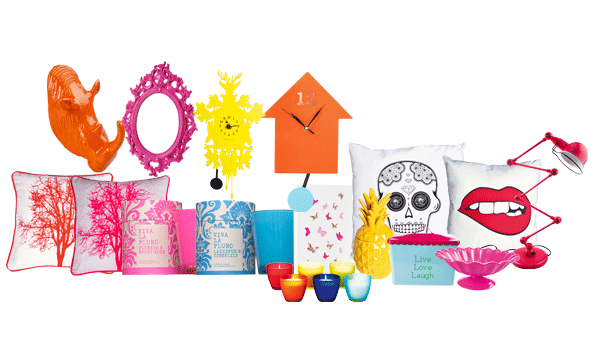 Neon tree coral cushion $66.70 from The Warehouse, cushions $45 each from Wild Willow creations, Butter flutter $89.99 from Ezibuy, Pink mirror $79.90 from Allium, Baby cuckoo clock $120 from Corso de Fiori, Exotic colour bird house clock $14.99 from The Warehouse, Pink fruit bowl $99.90 from Allium, Yellow pineapple $68.90 from Republic, Glass candle pots $12.99 each from Farmers, Bluepink tin $129 from Alluim, Pink lamp $229.90 from Chambers, Rhino head $49.90 from Allium, Viva la fluro larkspur and tigerlilly and gypsyrose $24.95 from The Aromatherapy company.