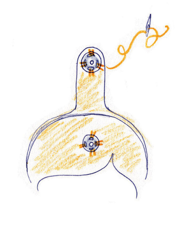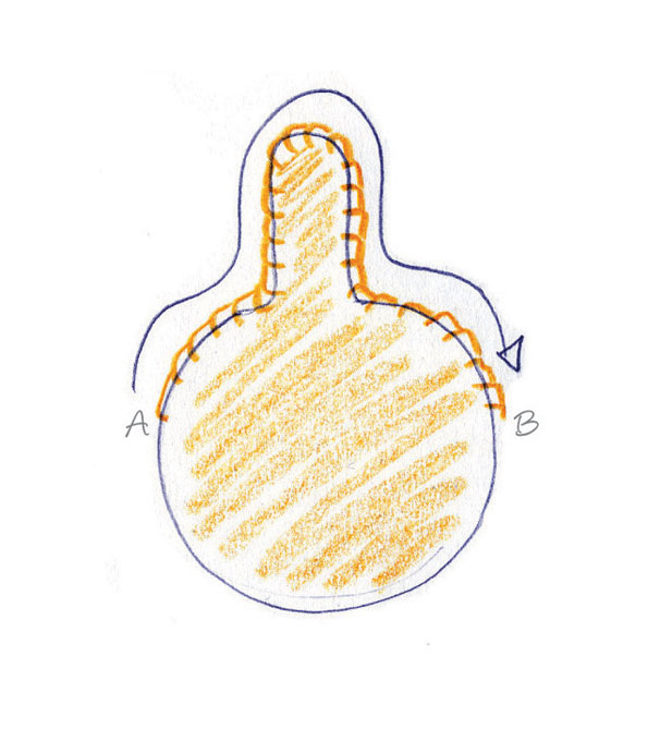 4.Place the face on top of the hair (with the eyes and mouth outwards) so that they line up all the way around and the tab sticks out at the top. Using blanket stitch, sew the face to the hair from point A to B in the opposite direction as you did before. This creates a pocket from the lower half of the face for the mirror to sit in. Change the colour of the thread to match when sewing the skin or hair.
