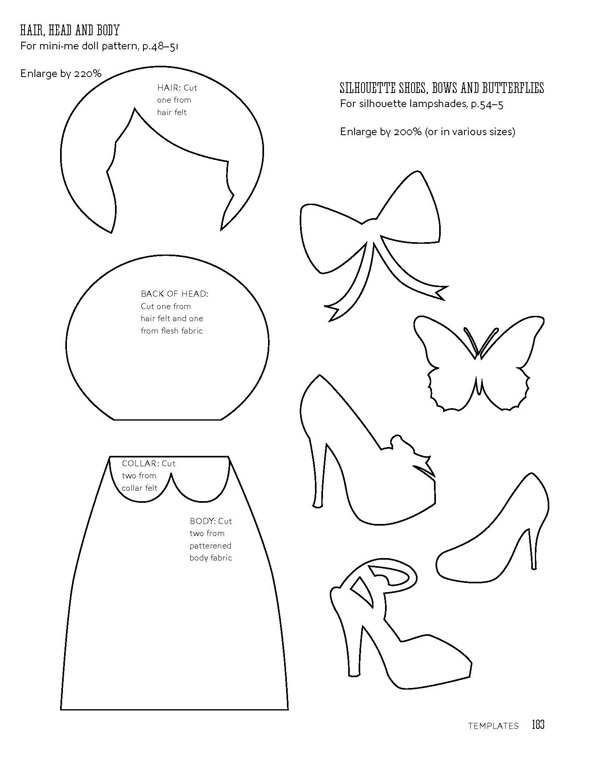 1 Using the templates, cut from the fresh fabric one head and four arms. Cut from the hair felt one back of the head and front hair section. Cut from the body fabric