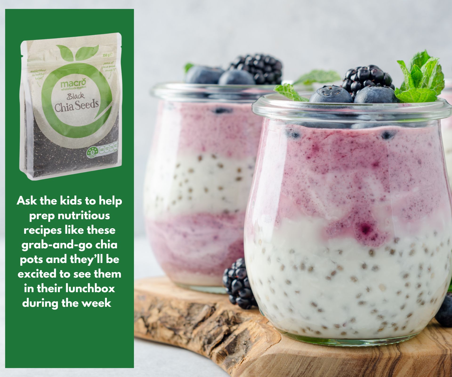 The evening before, combine one can of Macro Organic Coconut Milk with five tablespoons of Macro Black Chia Seeds. Add a tablespoon each of honey and vanilla essence, and mix all with a fork. Refrigerate overnight and in the morning portion into containers, and top with yoghurt, berries and/or sliced banana. Hot tip: Topping with frozen berries, like Macro Organic Frozen Mixed Berries, will help keep the pudding cool throughout the morning.