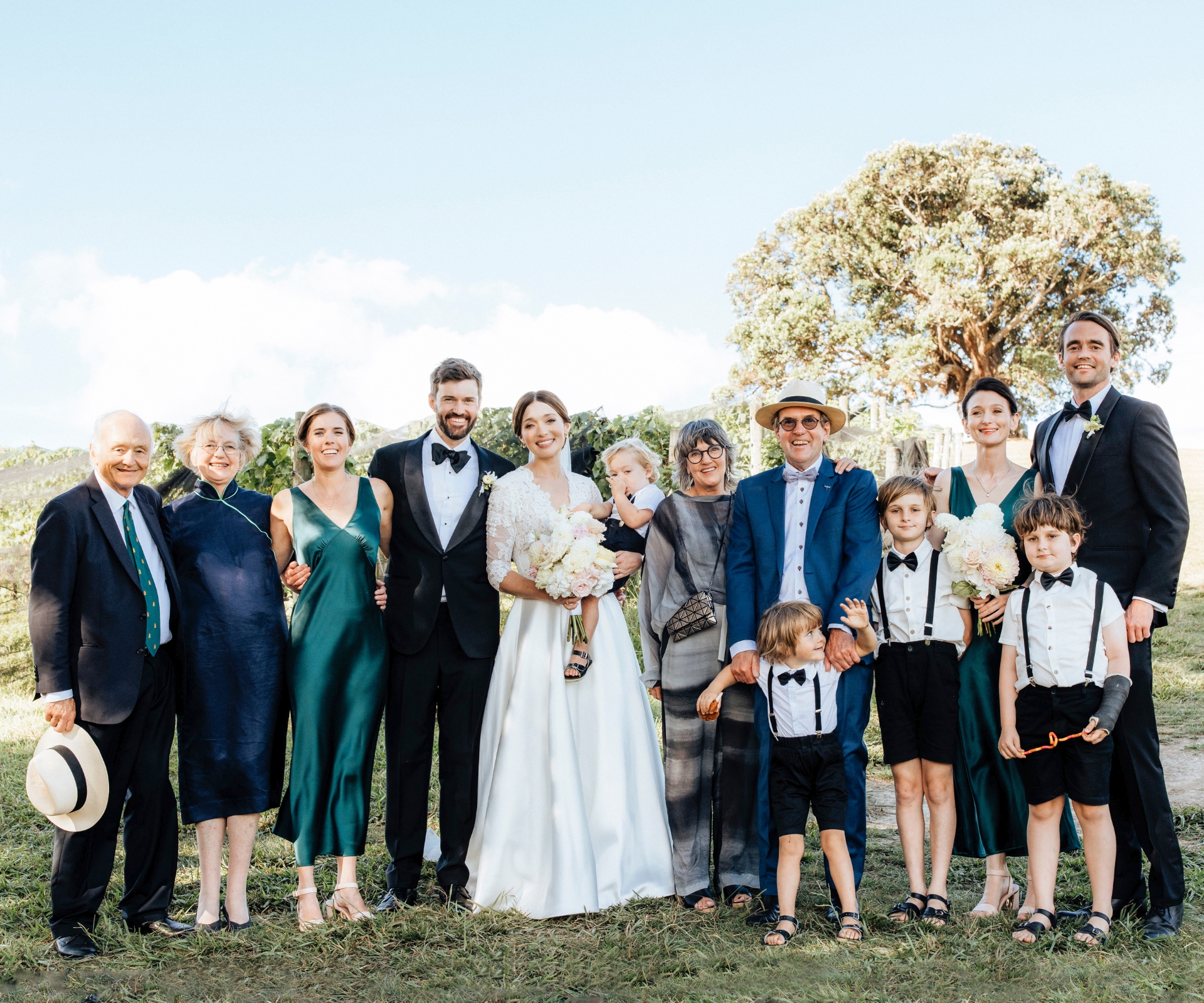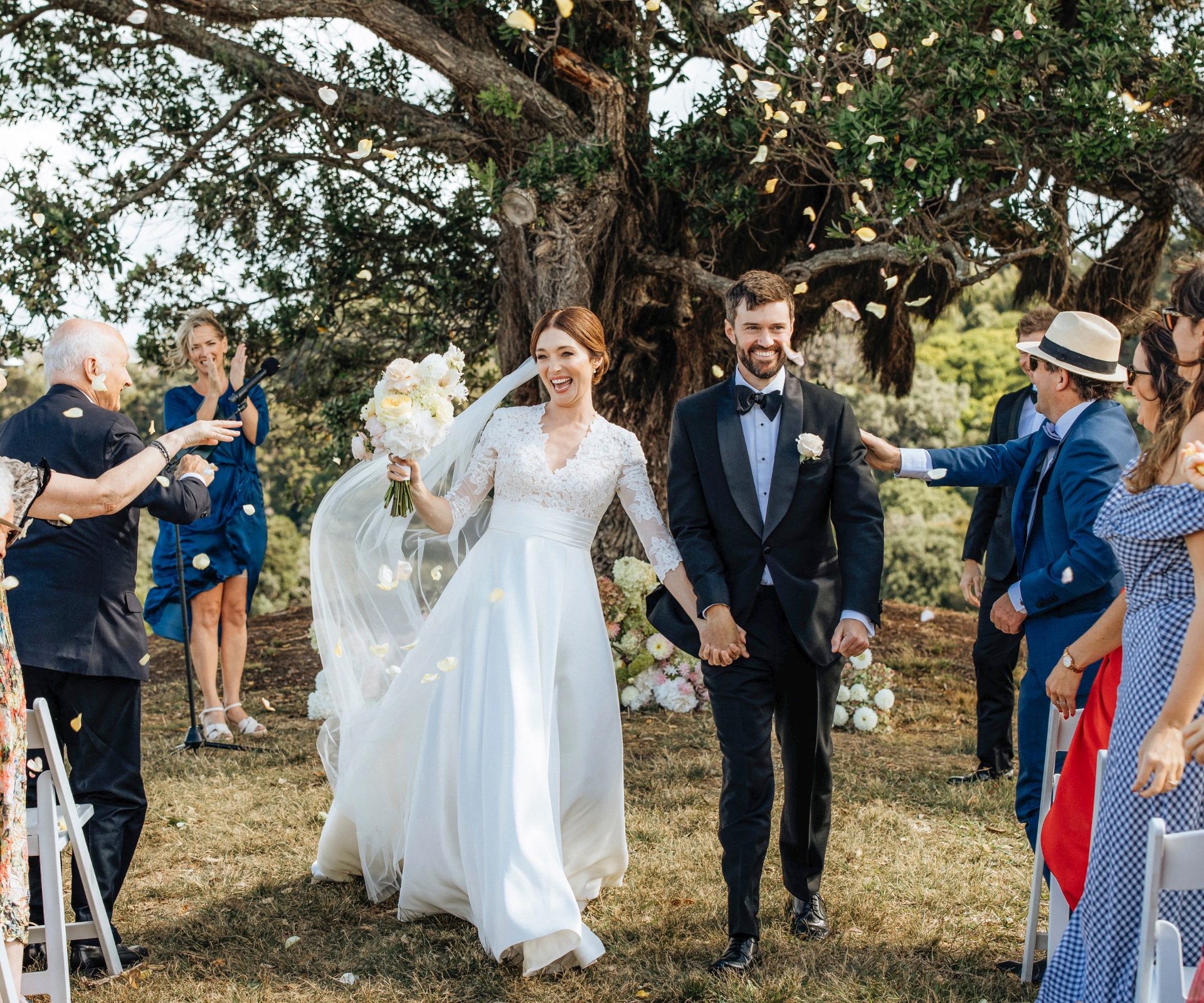 Today, though, it’s finally happening. Dan’s heart returning to its normal speed, he takes his place under the shade of a pōhutukawa tree next to his groomsmen, cousin Matt Sutherland and Antonia’s brother Ben Prebble, on a grassy ridge at Goldie Estate overlooking the Hauraki Gulf.
