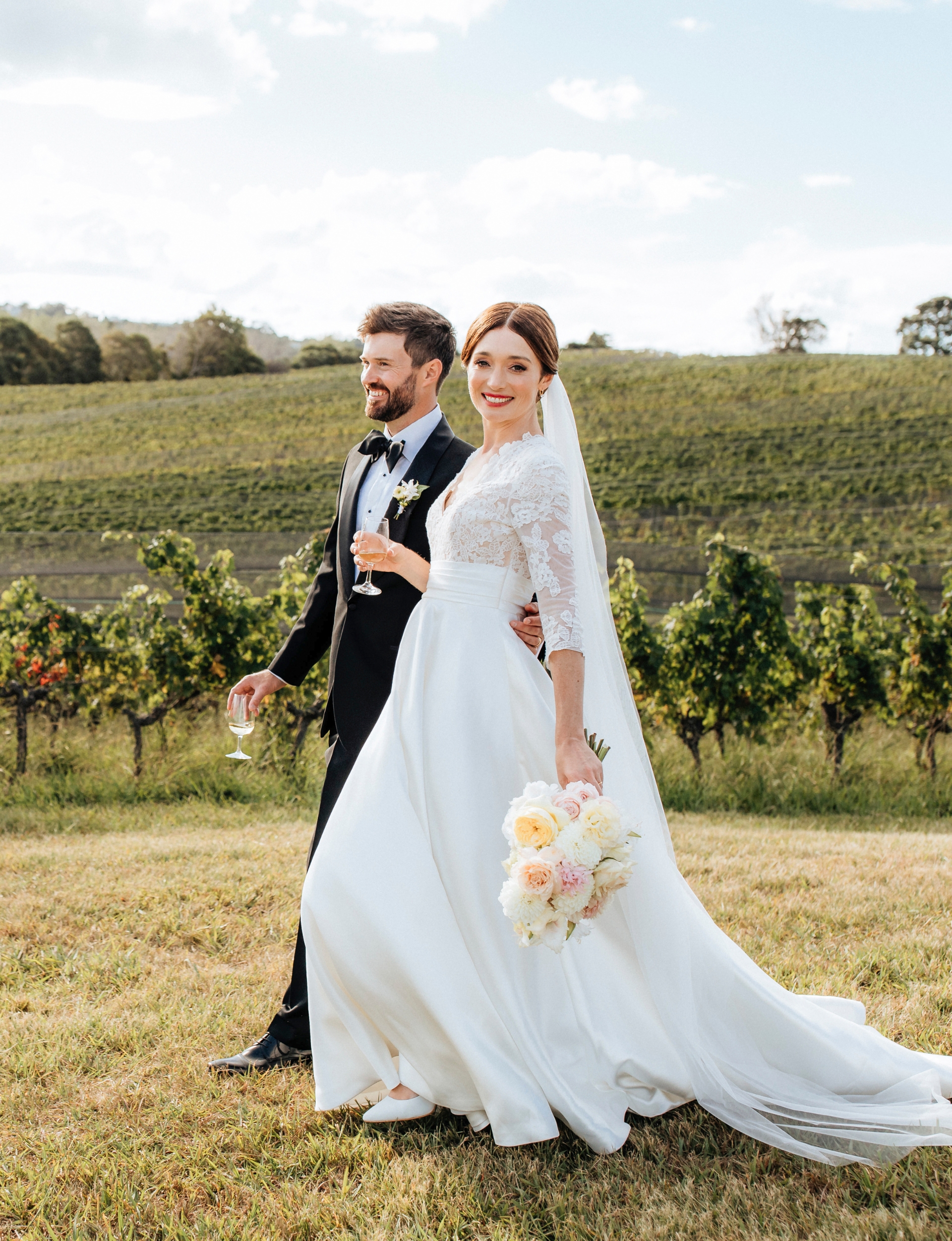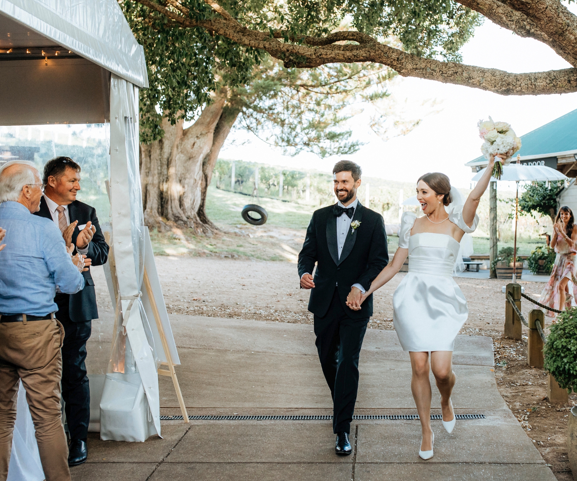 After a quick group photo, the wedding party is on the move, led by the newlyweds down the hill to the Goldie Estate cellar door, where Champagne is poured, canapés served and wedding celebrations begin.