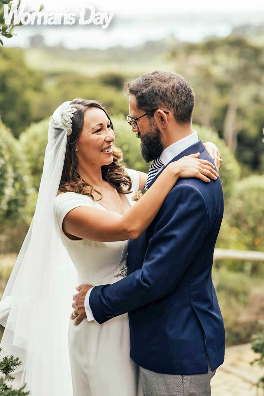 As the couple’s special song, On the Street Where You Live from the musical My Fair Lady, comes to an end, the beaming journalist arrives at the altar, overlooking the gleaming Hauraki Gulf, and throws back her veil, declaring to her groom, “I’m here!”