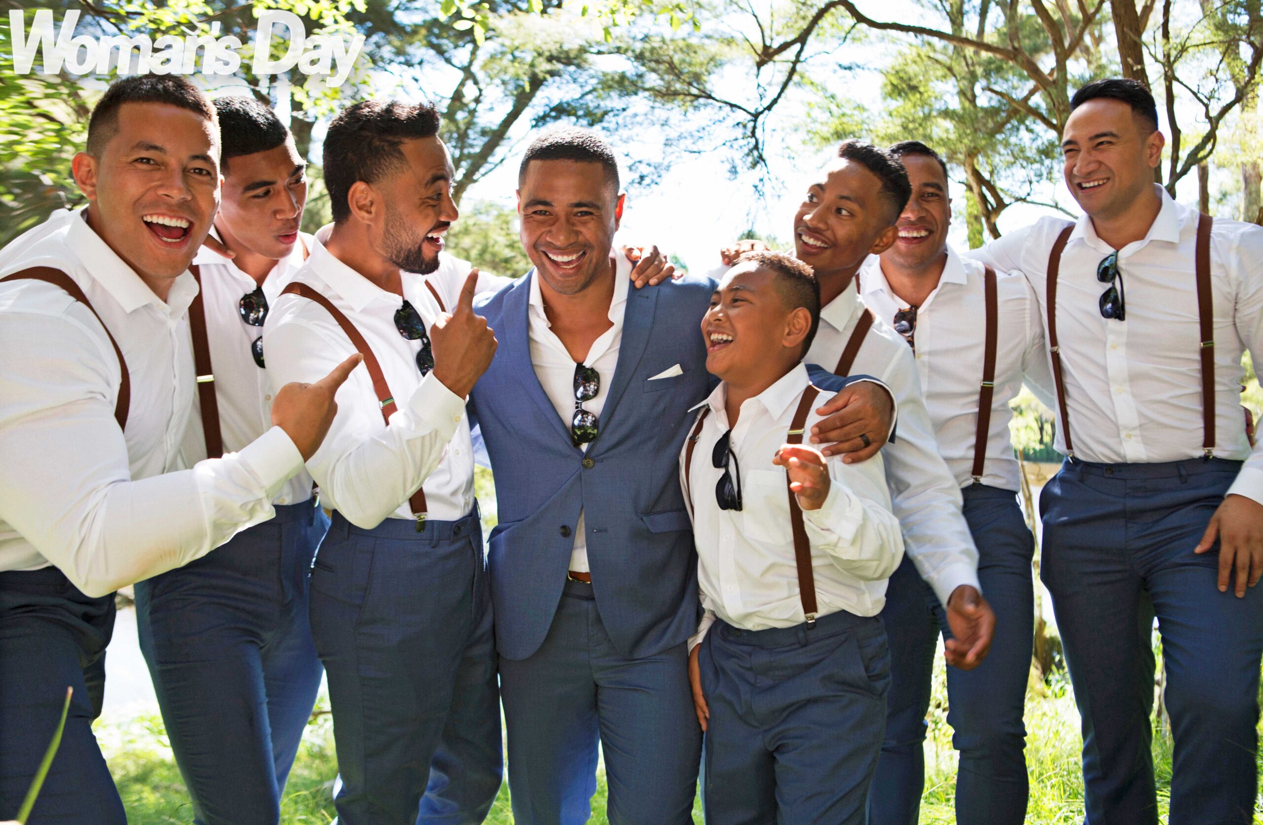 Beulah with his groomsmen (from left) Patrick Chu-Shing, brother Va’a, best man and brother James, brothers Milo and Mefi, and kids’ godfathers Dominic Ona-Ariki and Neil Amituanai.