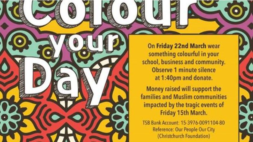 A “Colour Your Day” initiative has been organised by Christchurch youth worker Jay Geldard. People are encouraged to wear something colourful this Friday, March 22, to mark one week since the attacks.