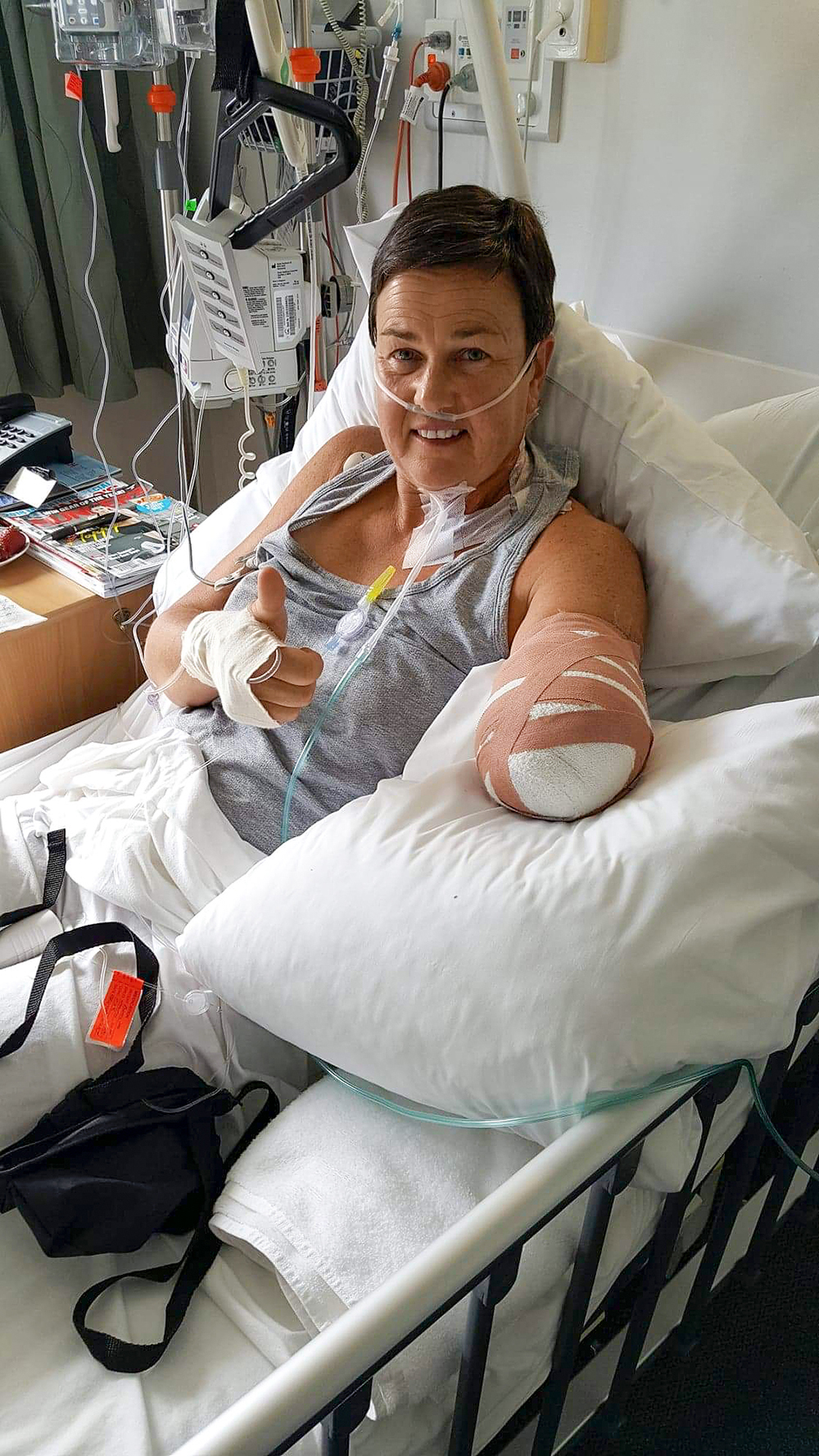 Shaz was closing a large iron gate on a farm in December 2016 when a huge gust of wind swept her up, slamming her onto a pipe between a post and the gate, snapping her arm in half. In hospital, she was told she’d need to go to theatre that evening to pin her bones back together and then she could expect a normal six-to-eight-week recovery.