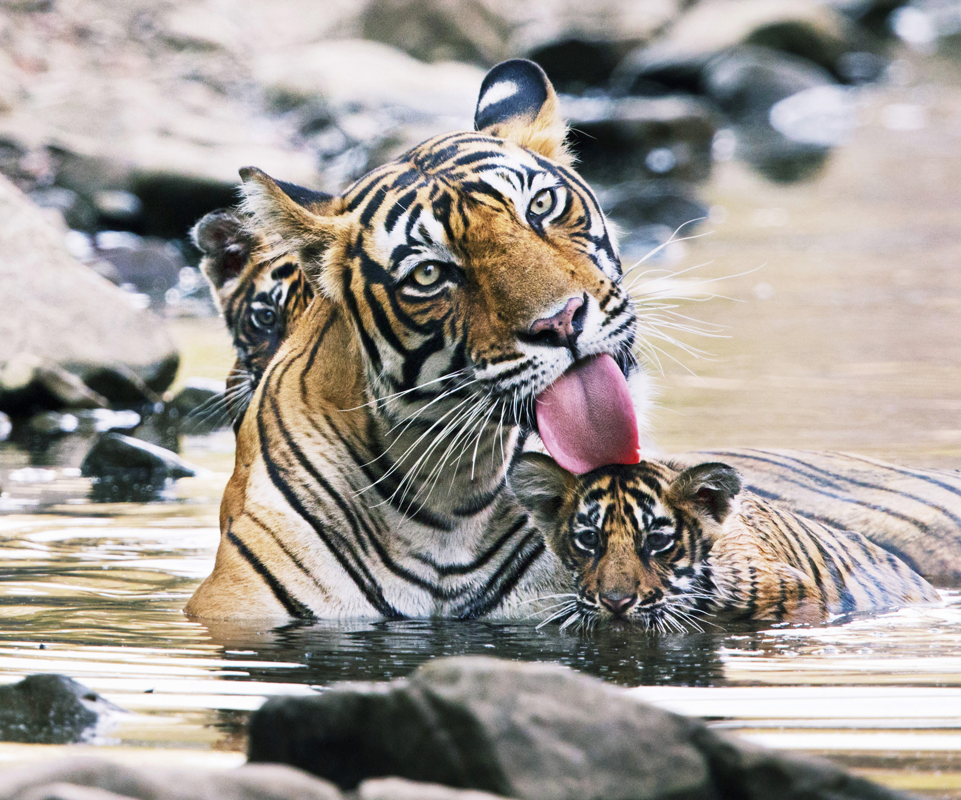 A mother tiger and her cubs. These rare animals can be seen on a safari tour in Ranthambore National Park.