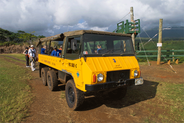 Kaua’i Backcountry Adventures is only a short distance from the airport, but I visited a few towns that weren’t on the route before I found it. I parked my little budget Chevy and surrendered myself to the care of leaders Zac and Misty. Three couples and I were herded into an Austrian Pinzgauer – a six-wheel-drive military vehicle that had the right kind of hauling power to tow us, and our gear, up the steep slopes of this old sugar cane plantation to the start of our adventure. Right around here, Zac tells us, is the rainiest spot in the world. They once had 350 consecutive days of rain – nearly 12m in one year! But on this winter’s day it was hot and fine, and good for ziplining. We were fitted with helmets, heavy harnesses and carabiners and given a demo of how to do it. There’s really only one rule: Don’t put your hands anywhere near the pulley mechanism – unless you are trying for a disability pension.